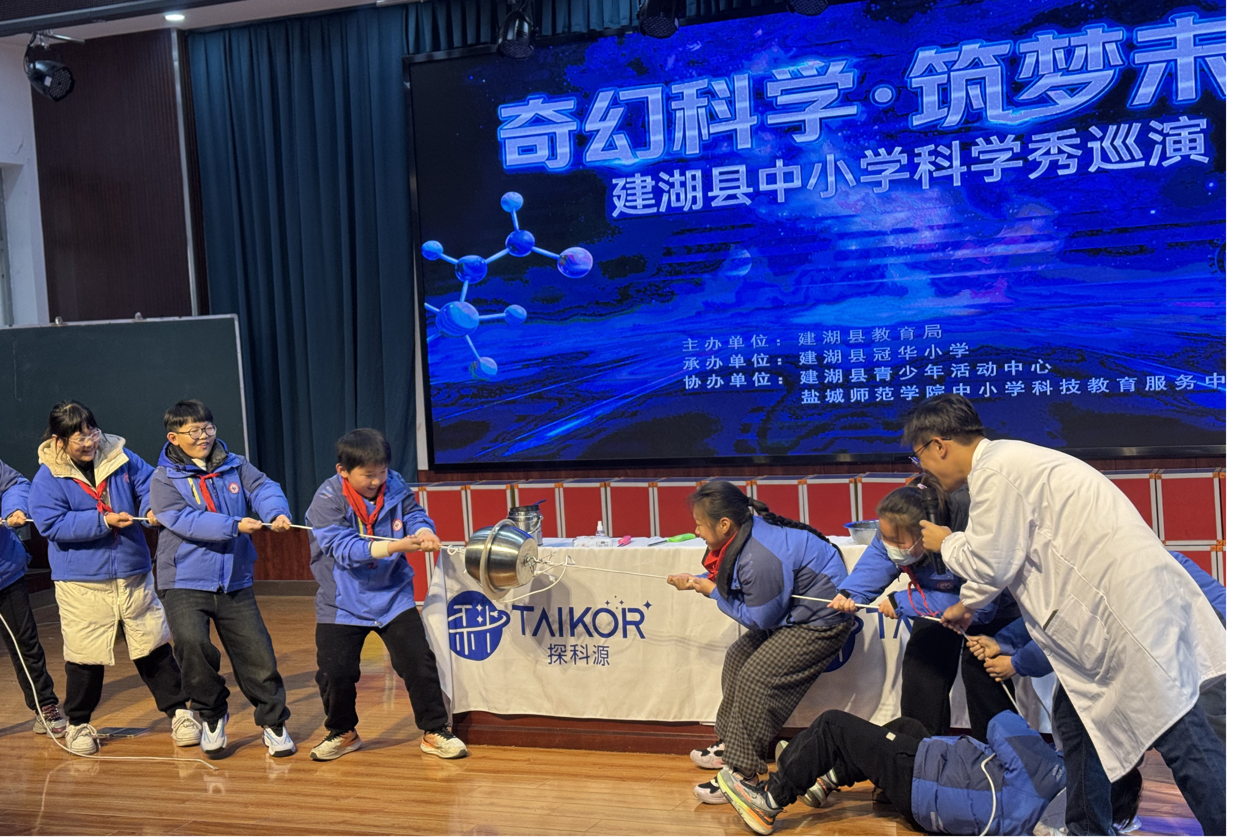 白雾升腾间解锁液氮奥秘,掌声欢呼声中点燃科创梦想。为深入贯彻落实教育部等七部门《关于加强中小学科技教育的意见》精神,推动县域科技教育高质量发展,1月13日至16日,由江苏省建湖县教育局主办,县青少年活动中心、盐城师范学院中小学科技教育服务中心联合协办的“奇幻科学 筑梦未来”科学秀巡演活动,在全县16所中小学精彩上演。这场历时4天、涵盖33场演出的科普盛宴,以沉浸式互动体验为载体,惠及21168名中小学生,为青少年播撒下科学探索的种子。