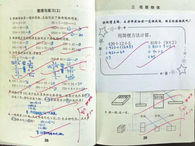 四年级数学老师王聪选择了“挑战式”,她对每次作业中写得特别好的学生,“奖励”一道题目。“题目不超纲,难度稍微抬一点点。一般一次作业,五分之一的学生会得到‘挑战’。”王聪表示,对于当天课堂知识掌握得特别好的学生,“挑战式”可以适当地促进提升。