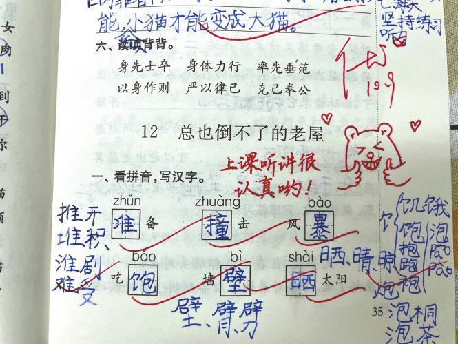 在三(2)班学生方远方的作业本上,他的语文老师朱虹,在作业批改上画了一支简洁的竹子,评语为“你的字苍劲有力”。而另一名学生则得到了一只卡通熊的图画,评语为“上课听讲很认真呦!”方远方说,现在每次作业本发回来,同学们都会怀着好奇的心态,查看彼此的作业本,得到“图画式”评语的心中窃喜,没得到的暗下决心努力争取。