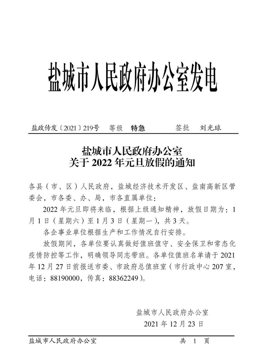 盐城市人民政府办公室关于2022年元旦放假的通知