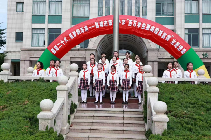 9月26日上午,盐城市教育局关工委在全市中小学统一举行了第四次“百万学生面向国旗宣誓”活动,全市746所中小学、幼儿园,因地、因校制宜地组织104.8万学生在雄壮的国歌声中,面对冉冉升起的五星红旗,在学校领导或优秀学生代表的带领下,庄重地举起右手:“我们在国旗下,向祖国庄严宣誓:我们,是中华人民共和国的接班人!明天,我们都是建设者;今天,我们为祖国繁荣而读书,时刻准备着,为共和国大厦添砖加瓦,无怨无悔。明天,我们都是护旗手;今天,我们为江山永固而读书,时刻准备着,为祖国献出我们的一切,红色基因,代代相传。明天,我们都是追梦人;今天,我们为中华腾飞而读书,时刻准备着,为中华民族的伟大复兴,披荆斩棘,勇往直前。”一句句铿锵有力的誓言,极大地激发了广大学生爱党、爱国、爱社会主义的情怀,从字里行间能欣然看到孩子们心目中的民族脊梁,领略到他们的家国情怀。
