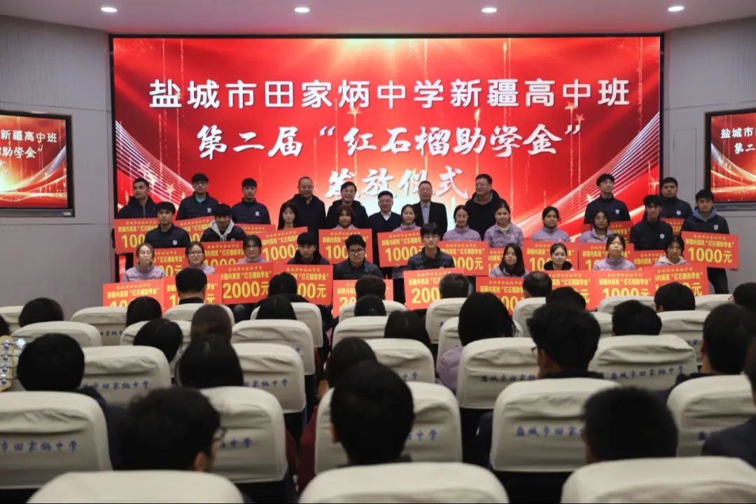 2023年底,盐城市田家炳中学新疆内高班“红石榴助学金”项目正式启动。2024年1月15日,在第一届“红石榴助学金”发放仪式上,13家爱心助学企业共计向58名学生、6名教师发放15.8万元助学金。“这份沉甸甸的爱,带给我们的不仅是生活无虞的温暖,更是奋力拼搏的动能。”盐城市田家炳中学党委书记、校长刘晶在发放仪式上说,“我们深知,‘红石榴助学金’的设立,是党和政府对民族教育事业的重视和关心,是爱心企业家们对天山学子的关爱和奉献,是大家对新疆内高班师生的托付和厚望。在今后的工作中,我们必将以勇于担当的精神,砥砺深耕的底色,书写让人民满意的答卷!”