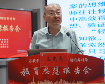 【主题报告】“苏教名家”培养对象王克亮汇报的主题是“以问启智,涵育素养:重构高中数学课堂”。他系统阐述了该教学主张的缘起背景、形成过程、内涵意义、实施路径与推广应用。该主张以涵育学生数学学科素养为核心,以提升学生“四能”(即发现与提出问题的能力、分析与解决问题的能力)为关键,以打造“问题—解决”式课堂为目标,创新构建了“四问驱动”教学范式,重塑了高中数学课堂的结构与形态,并形成可操作的实践路径。
